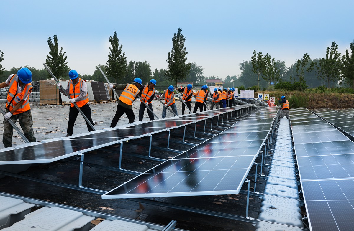 5月11日,電力分公司青東塌陷區(qū)水面光伏板正在組裝下水