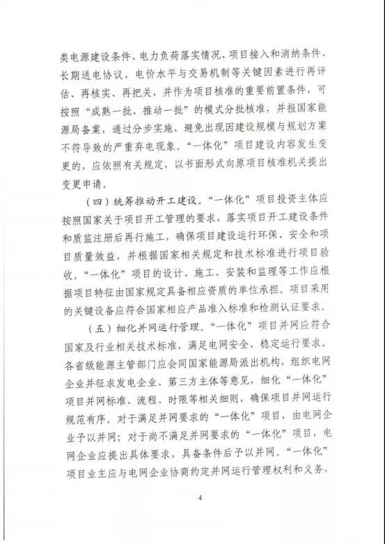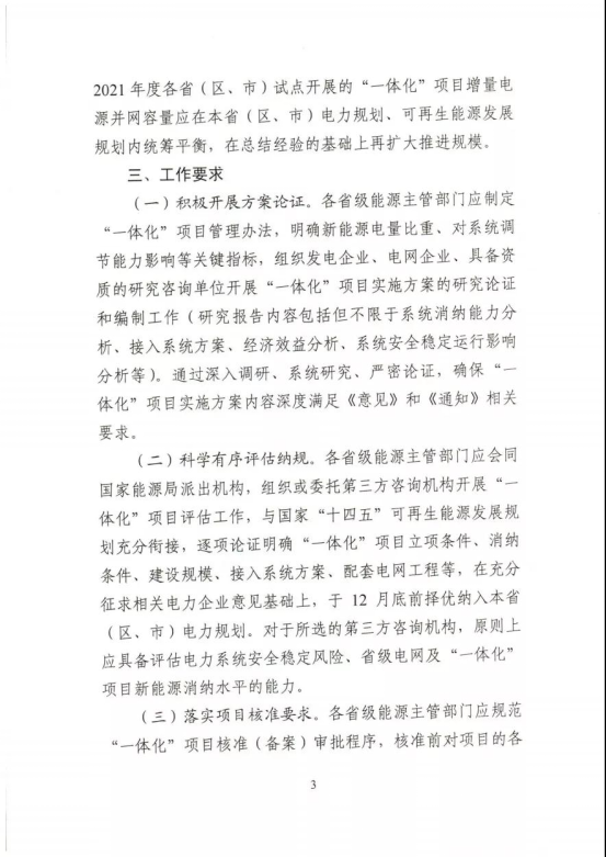 工作要求:積極開展方案論證。科學(xué)有序評(píng)估納規(guī)。落實(shí)項(xiàng)目核準(zhǔn)要求。統(tǒng)籌推動(dòng)開工建設(shè)。細(xì)化并網(wǎng)運(yùn)行管理。優(yōu)先推進(jìn)鄉(xiāng)村振興項(xiàng)目。鼓勵(lì)重大創(chuàng)新示范。在上述工作要求中,《通知》要求,各省級(jí)能源主管部門應(yīng)開展“一體化”項(xiàng)目評(píng)估工作,與國(guó)家“十四五”可再生能源發(fā)展規(guī)劃充分銜接,逐項(xiàng)論證明確“一體化”項(xiàng)目立項(xiàng)條件、消納條件、建設(shè)規(guī)模、接入系統(tǒng)方案、配套電網(wǎng)工程等,在充分征求相關(guān)電力企業(yè)意見基礎(chǔ)上,于12月底前擇優(yōu)納入本?。▍^(qū)、市)電力規(guī)劃。